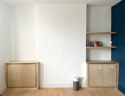 The perenially-popular Birch Ply, here we made some alcove units and floating shelves for a clean, crisp look.