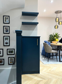A lower cabinet and upper bookshelf unit for a new build in Clapton, London. We designed this to match a set a of requirements from the customer about storage and the need for use with a turntable and speakers. The lower cabinet doors and push-to-open and the whole job was sprayed in F&B ‘Skimming Stone’ to match the walls.