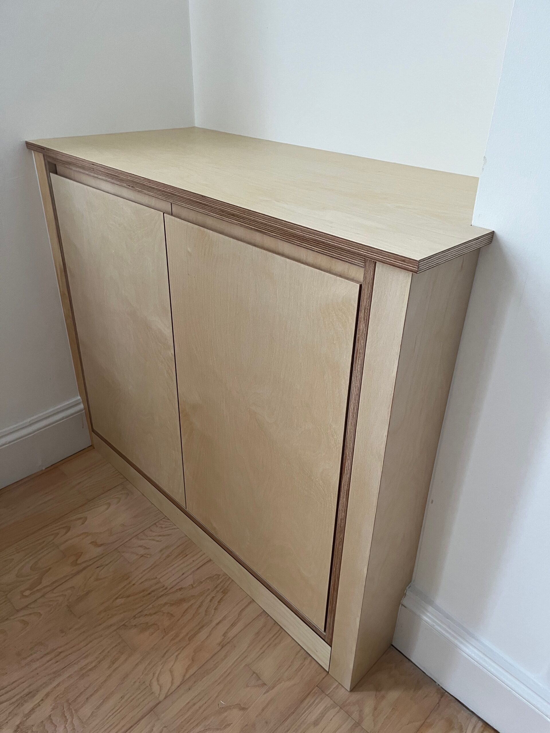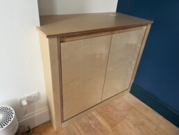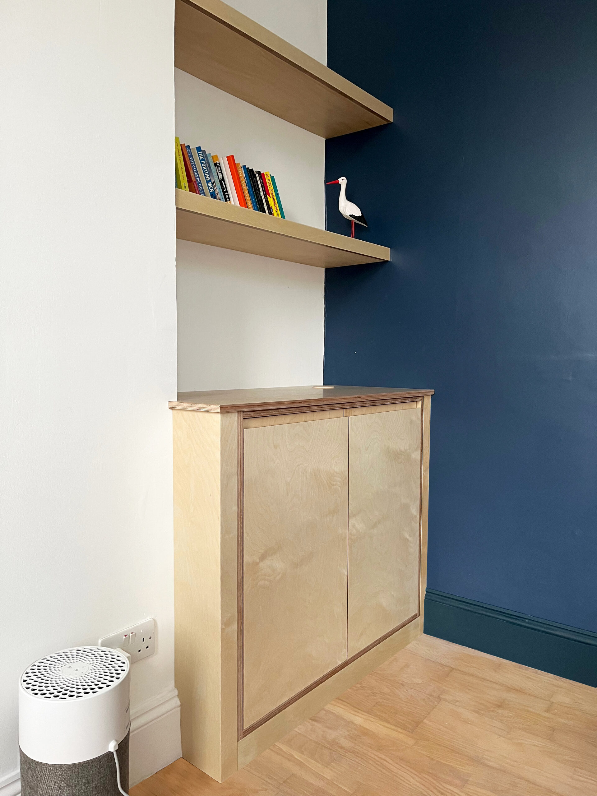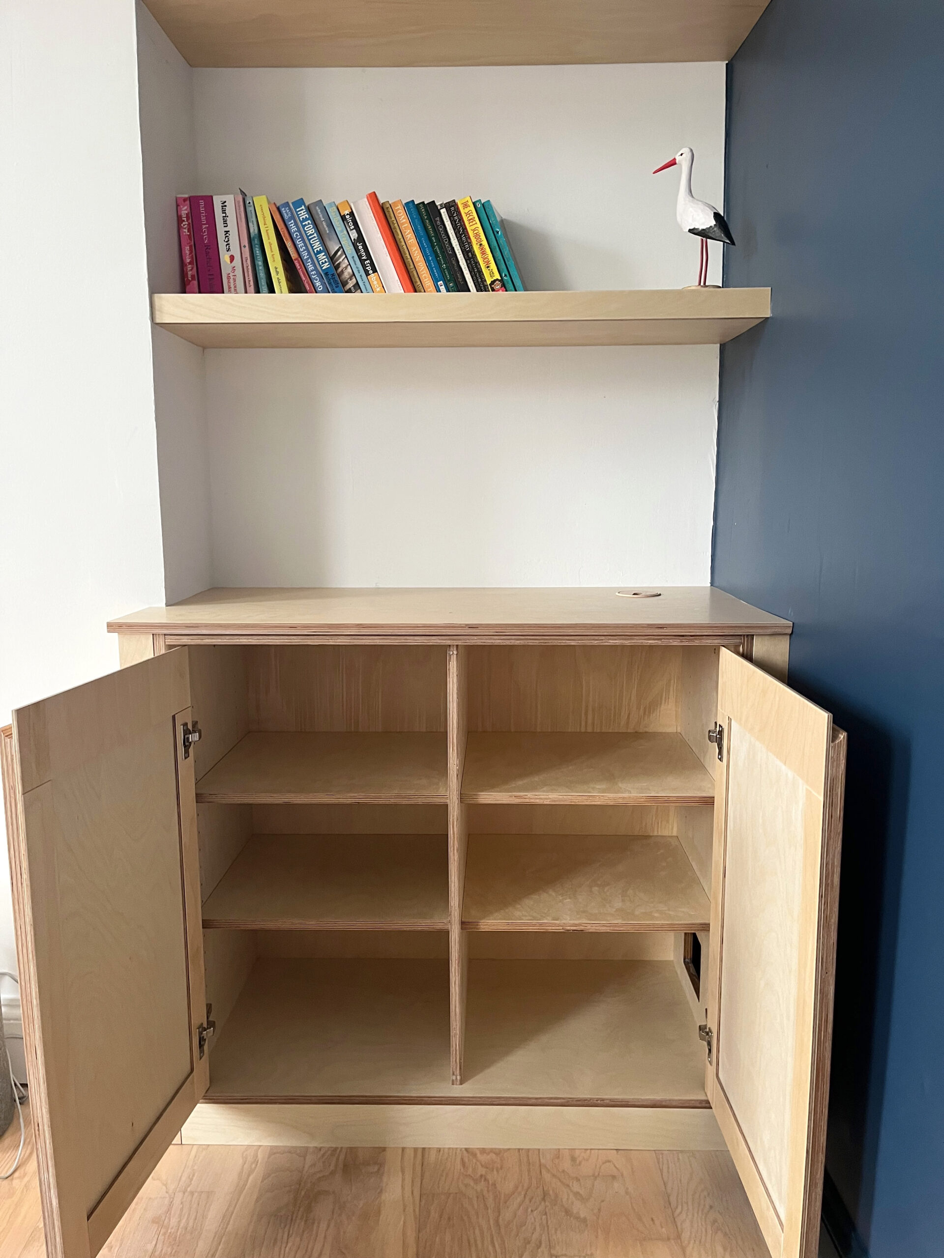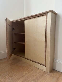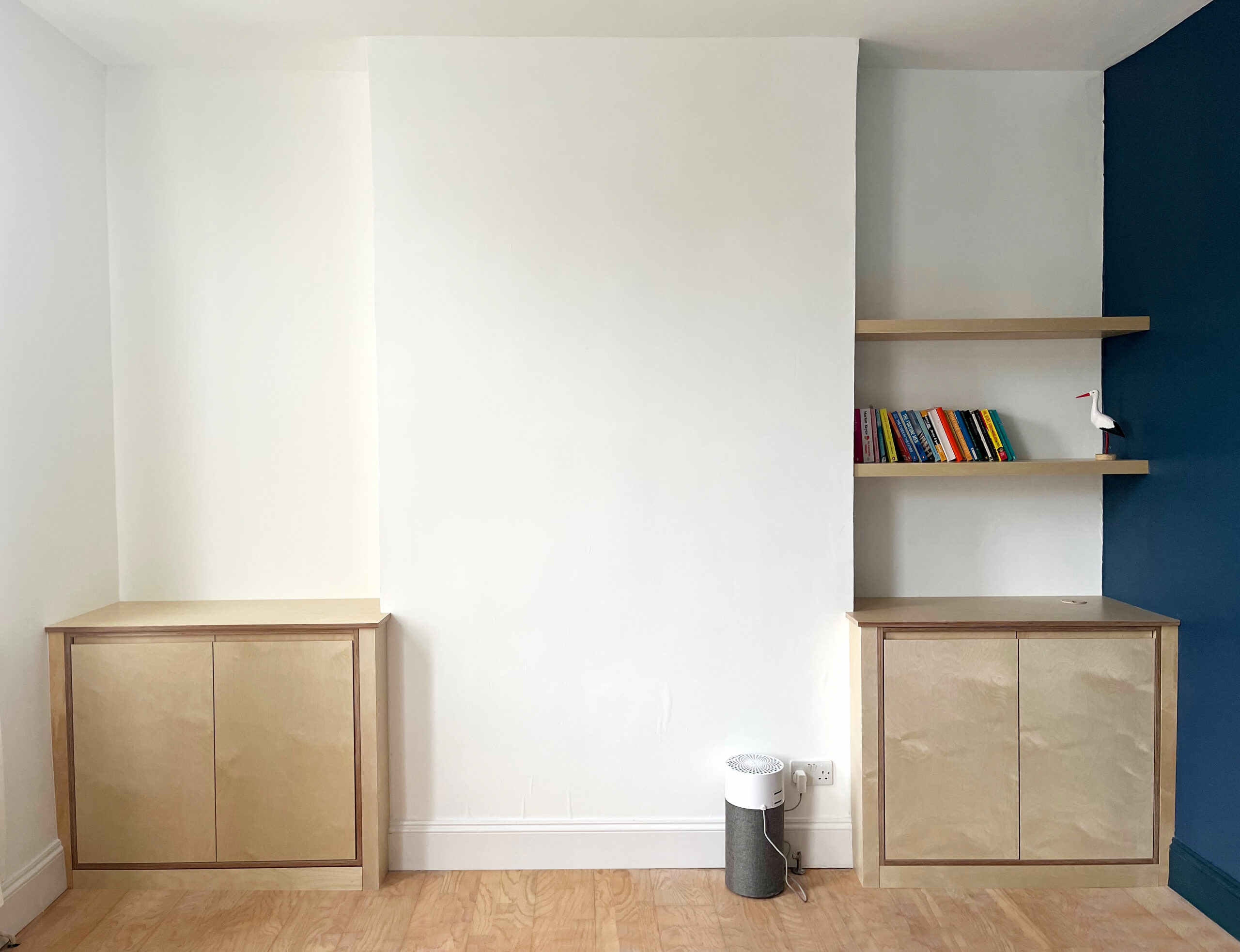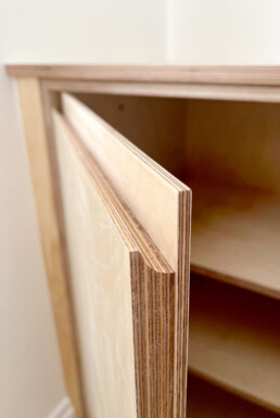 LocationStoke Newington, N16, LondonMaterialsBirch Ply with Clear Lacquer Spray FinishJob DetailsThese Birch Ply cabinets were made a little differently to how we normally build them. The customer was so keen on the ply 'striping' on the edges, that we slightly changed the design to show a cabinet edge all round the front face and also allowed an edge to show on the floating shelving. The cabinets have 'J-pull' fingerpulls on the tops of the doors, which makes for a handleless design. Nice and clean design details.